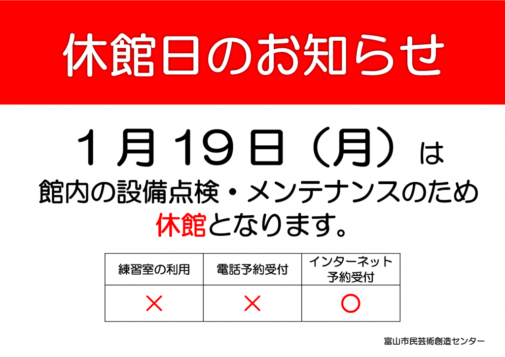 館内の設備点検・メンテナンスのため、1月19日(月) は 休館 させていただきます。 なお、予約受付業務は休止いたしますが、インターネットからの予約は可能です。
