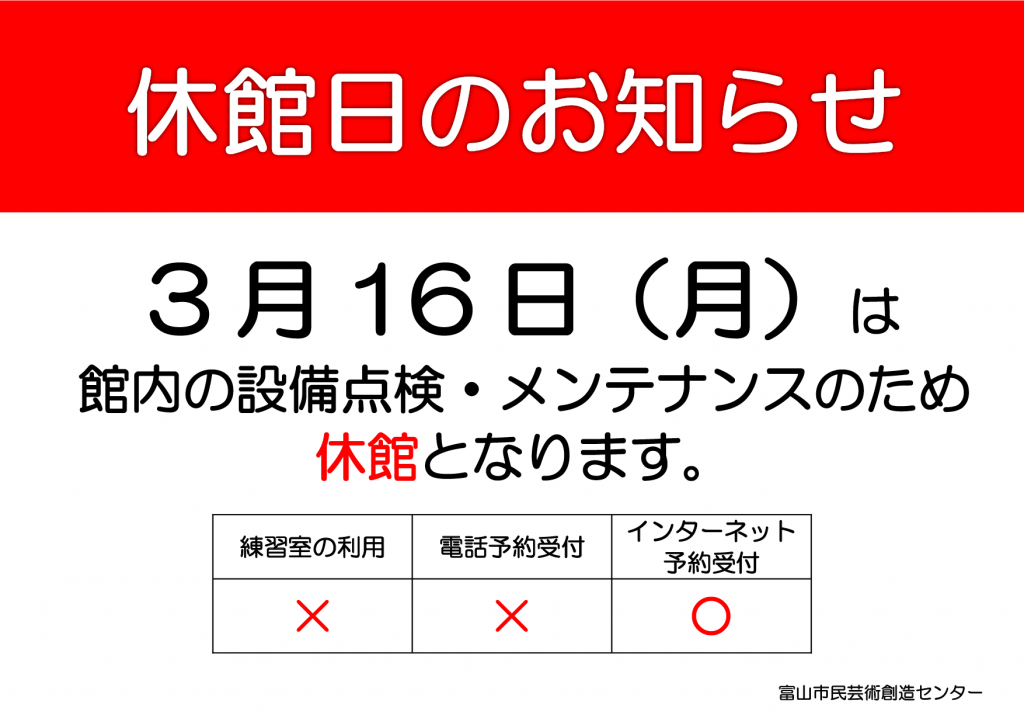 館内の設備点検・メンテナンスのため、3月16日(月) 休館 させていただきます。 なお、予約受付業務は休止いたしますが、インターネットからの予約は可能です。